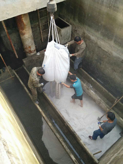 4.3鵝卵石墊層裝填完后,再裝填石英砂濾料層,填鋪450mm高度 因濾料層比墊層粒徑小,石英砂濾料層要與鵝卵石墊層充分接觸,且分布要均勻,裝填完石英砂濾料層后再用同樣的方法將剩余的無煙煤濾料填鋪350mm高度完,然后用刮板將濾料層刮平。